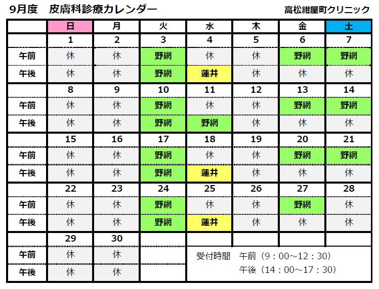 9月の皮膚科診療は下記の通りです。