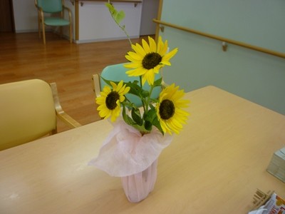 レストランにひまわりを飾ると、入居者様が、「昔のひまわりの花は人の顔ぐらいは大きさがあったよね」とニコニコしながら言われると、他の入居者様何人かが、大きくうなずいておられました やっぱり、花はいいですね