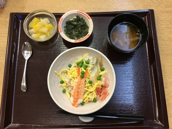 今日の夕ご飯はちらし寿司でした グリンピースの緑、錦糸卵の黄色、海老と紅しょうがの赤、あなごの白で色鮮やかですね お食事を召し上がられた入居者様達から今回も「美味しかった」とご好評をいただけました。