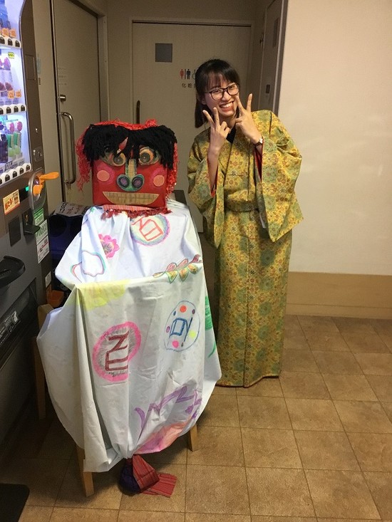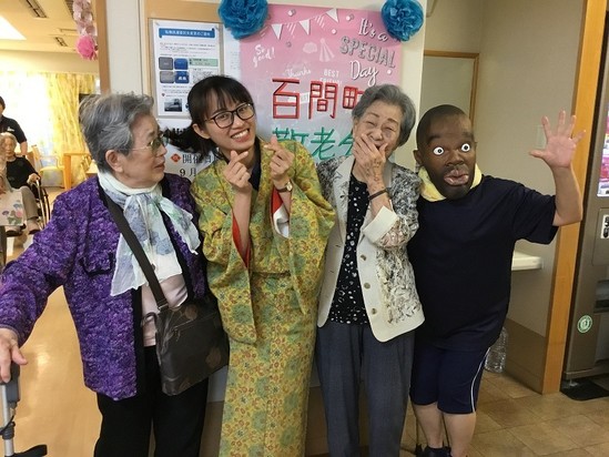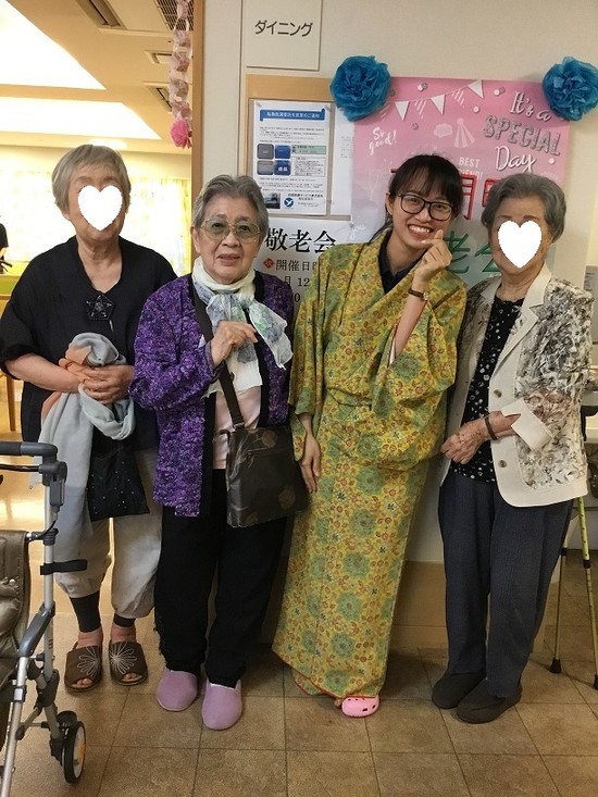 留学生のハーさん。 着物を着るのは初めてだそうでとても似合っています。 入居者さまからも「カワイイ、よく似合ってるわね~」と褒められて とてもうれしそう