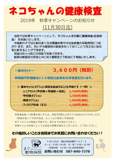 秋の健診キャンペーンは主に猫ちゃんを対象としています。