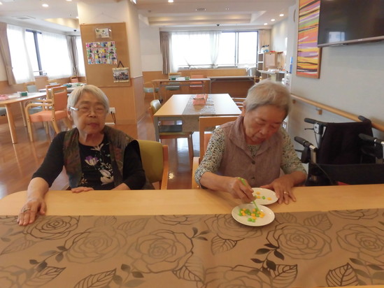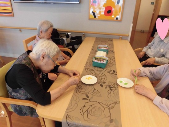 今日の日曜レクはタイムアタックゲーム、お箸を使って、お皿からお皿へまめを移動させて