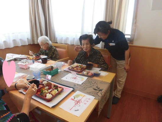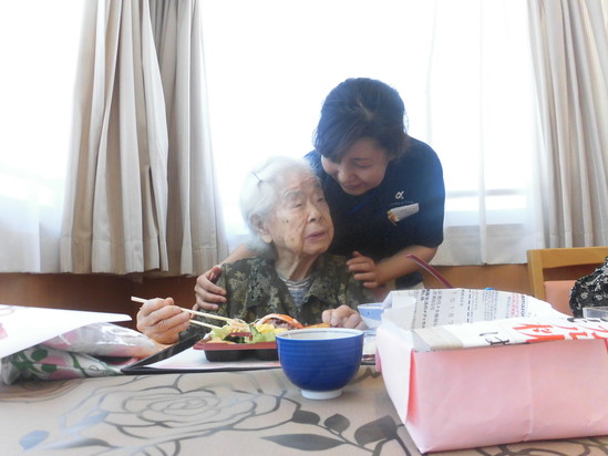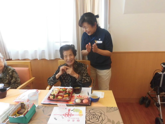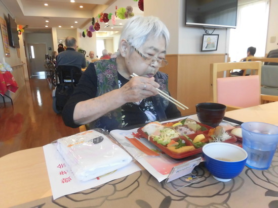 今日のお昼は、見た目も楽しいお弁当です。 紅白のお饅頭もついています。