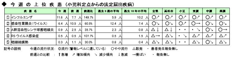 そこで、香川県ではホームページには感染症情報というページ(https://www.pref.kagawa.lg.jp/content/etc/subsite/kansenshoujouhou/hou/index.shtml)があり、インフルエンザを含めた感染症の流行情報を週報としてお知らせしています。