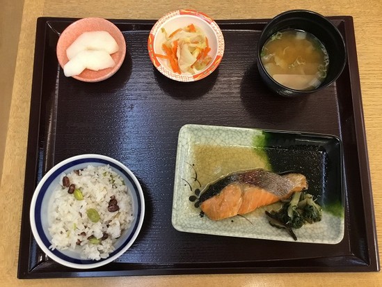 本日の昼食は萩ごはんでした。小豆と枝豆の混ぜご飯は豆がほっくりしておいしかったですよしじみの味噌汁がご飯によく合いました 秋鮭の焼き浸しや梨といった秋が旬の食べ物が揃い踏みで食欲の秋を満喫しました