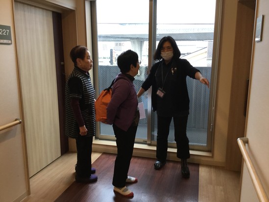 「ただいまより避難訓練を始めます。スタッフの指示があるまで居室にて待機してください。」という放送とともに火災報知器が作動、スタッフが火元確認と初期消火へ向かいます。