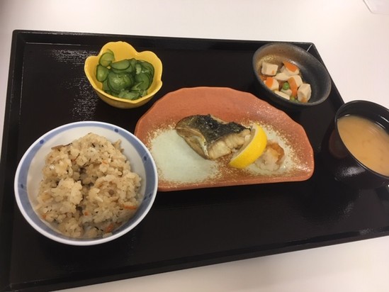 秋の訪れを告げる炊き込みご飯と塩麴をつかったホッケがやわらかく、レモンと大根おろしがアクセントになって、とても美味しかったです。味噌汁の中にも、さつまいもが入っていたのが印象的でした。