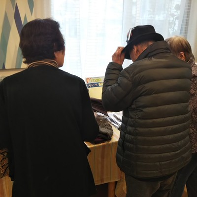 こちらの男性は同じフロアのご入居者様に帽子を見立ててもらっていました。