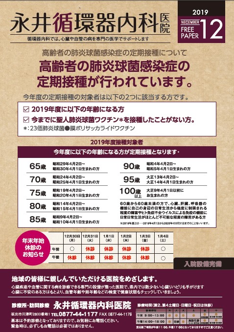 フリーペーパー12月号発行しました。今月は肺炎球菌ワクチンの話題と感染症の予防方法となっております。また年末年始休診日のお知らせもあります。