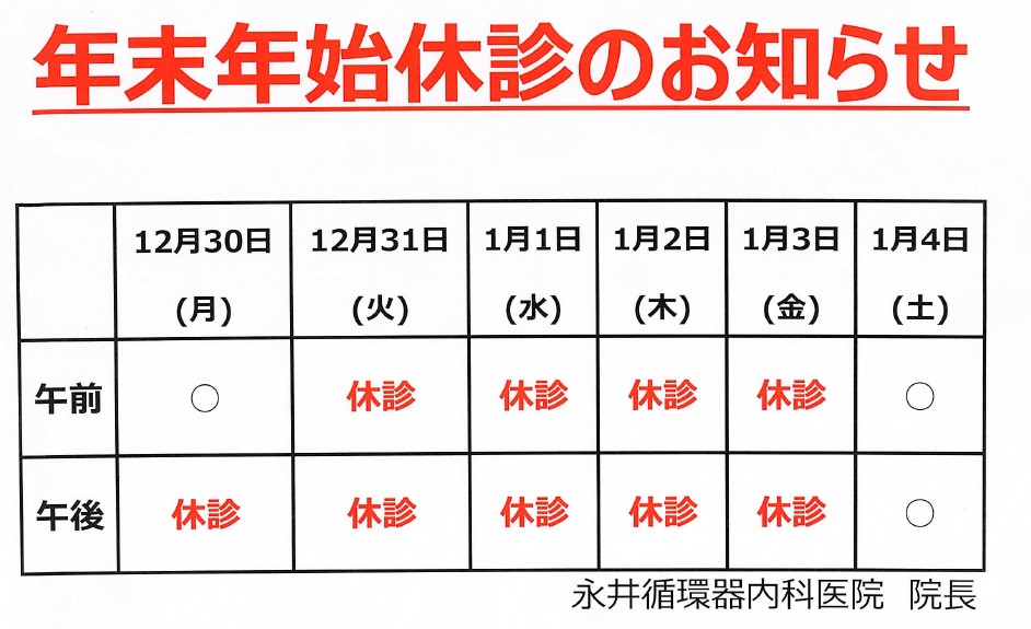 令和元年12月30日(月)午前診療(9:00~13:00)/午後休診 令和元年12月31日(火)休診 令和2年1月1日(水) 休診 令和2年1月2日(木) 休診 令和2年1月3日(金) 休診 令和2年1月4日(土)通常診療 となります。 ご迷惑をおかけいたしますが、ご了承ください。