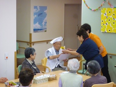 続いて米寿のお祝いで記念品とお花をお渡ししています。