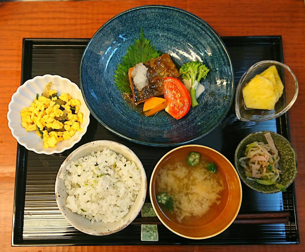 鯵の蒲焼き ほうれん草と卵の炒め物 胡麻酢和え 雷汁 混ぜご飯 フルーツ