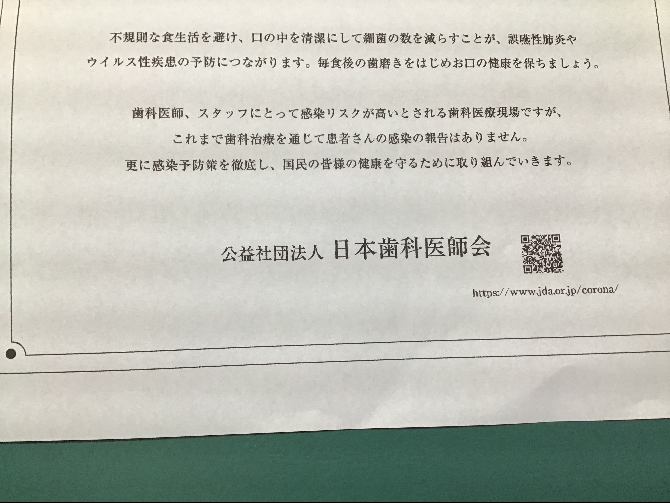 歯科医師会が調査した結果、全国で治療を通じて患者さんが新型コロナに感染したケースはないとのことです。