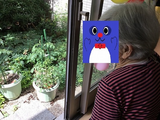 昨日はトマトの実が赤々としていたので今日は収穫しようかと思っていたのですが、いざトマトを見てみると赤い実がなくなっていて、あれれ?とA様、N様と不思議がっていると夜勤スタッフさんから「今朝、赤いトマトが落ちてたよ」と悲しいご報告……。