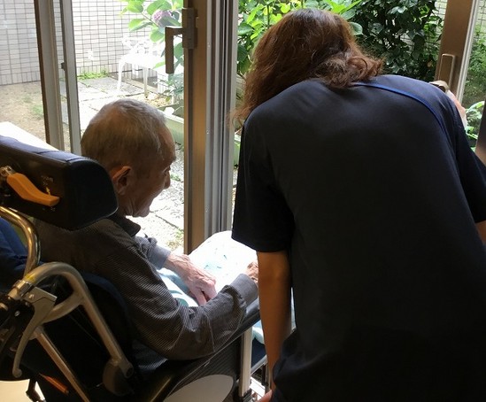 雨で土もぬかるんでいるので入居者様の安全に配慮し、今回はお庭に出れませんが、食堂から一番良く見えるトマトの観察をしていました。
