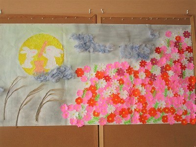 「どこに貼る?」 「こうしたほうが、ええわ。」 皆さん、色々なアイデアを出して下さいます。 完成した壁画は・・・ 皆さんの思いが込められた素敵な仕上がりとなりました。 秋の訪れが、楽しみです(*^-^*) 担当:沖本
