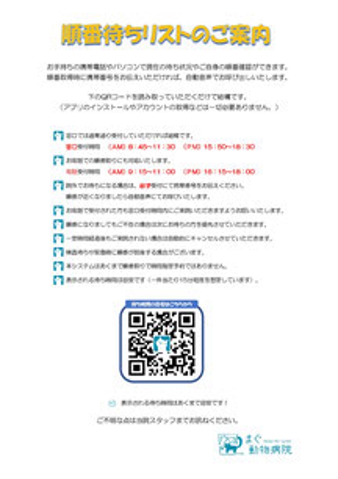 当院(院内)での待ち時間解消を目的に順番取りシステムを導入することになりました。 本システムにより診察の順番までの時間を院外やご自宅で待機していただくことも可能になります。 また、現在の待ち人数や待ち時間の目安、ご自身の順番もお手持ちのスマートフォンでご確認いただけます。 当院ホームページからもご確認いただけます。 (詳しくはこちら)