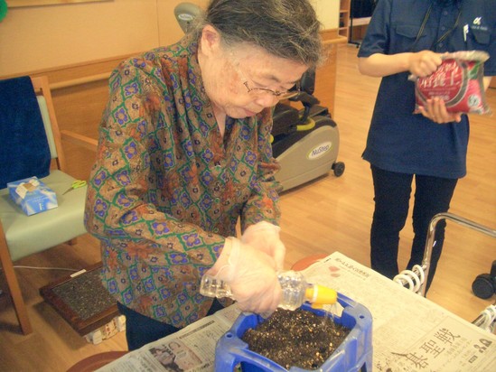梅雨が明けるとすぐに夏休みが来ますよね… という事で、急に思い立って朝顔の種をまきました。 小学生のお子さんがおられる方は、夏休みに入る前に、 学校から朝顔の鉢を持って帰ってきますよね。 職員の家にも、 以前学校から持って帰ってきた朝顔セットがあるという事で、 持ってきてくれました。 お花の栽培には少し疎い職員たち…(^_^;) 利用者の皆さんの力を借りて、作業に入りました。 お水もしっかり上げて、 芽が出るのが楽しみです 担当:沖本