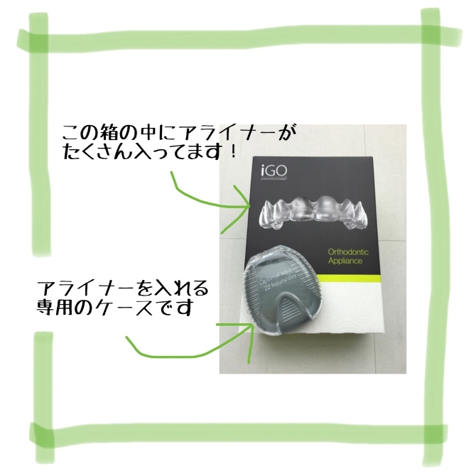 ついにアライナー(透明なマウスピース)が届きました! アライナーがこの緑の箱に入っています。また、専用のアライナーケースももらいました。 食事の際はアライナーを外しますが、外したアライナーをそのまま机に置いたり、ティッシュに包んでいるとゴミと間違えて捨ててしまうこともあるため、専用の容器に入れることをお勧めします。