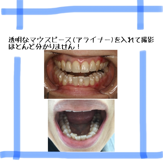 実際にアライナーを入れた状態です。 ほとんど目立たず、自然ですね! 初めはしゃべりにくさや違和感はありますが、徐々に慣れていきますので、頑張って使います!(^^b