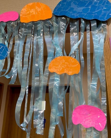 さて、デイルームからトイレに行くまでの間に、沢山のクラゲを飾りました✨