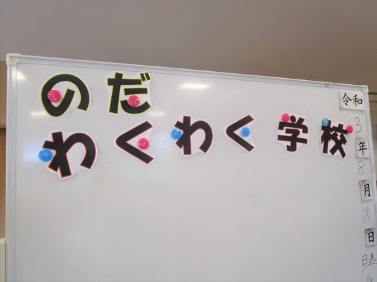 ホワイトボードのわくわく学校の文字と、