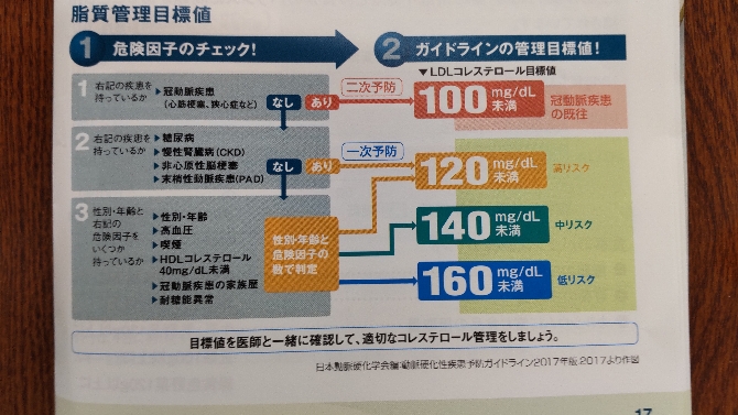 動脈硬化学会では、それらの危険因子の数によって脂質管理目標を定めており(別表参照)、それにあわせて目標まで下げるようにしていく必要があります。