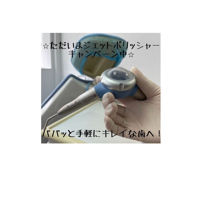 ジェットポリッシャーというのは、重炭酸ナトリウム塩を専用の機械を用いて歯の表面に勢いよく吹き付けることで着色を取り除く処置です。細かな汚れも除去することができるので、虫歯や歯周病の予防にもなります。