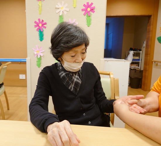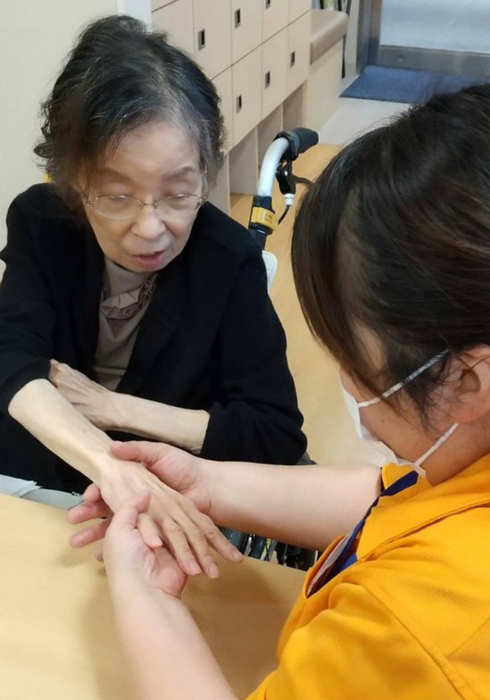 皆さんの手を時間をかけて触ることはなかったので、可愛らしい手をしている方、骨がしっかりされている方、モチモチ肌の方、いろんな手に出会いました!普段、なかなかマンツーマンでゆっくりお話ししたり、手と手が触れあったりというの機会は取れていなかったので今回は、利用者様にもとても喜んでいただけました。これからも、ハンドマッサージの時間を設けて、お話ししたり、マッサージでリフレッシュしてもらえたらと思います