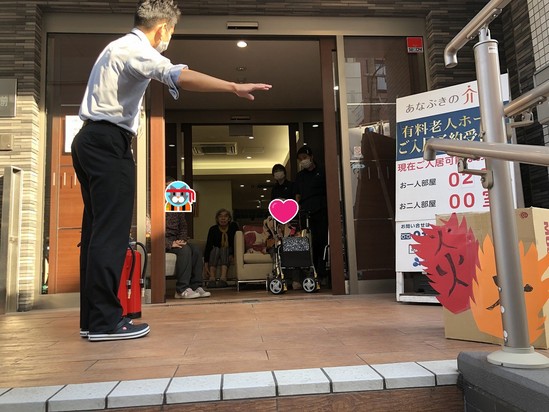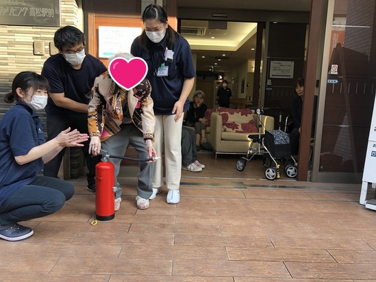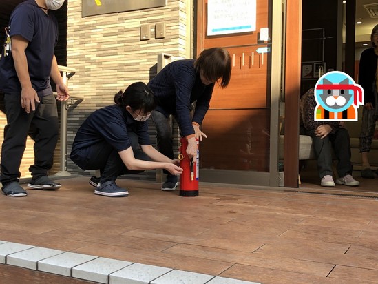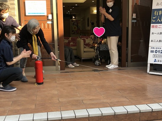 その後、ご入居者様、職員ともに実際に消火器を使用しての消火練習を行いました。