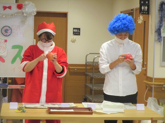 りんごの皮むき対決をしたり、