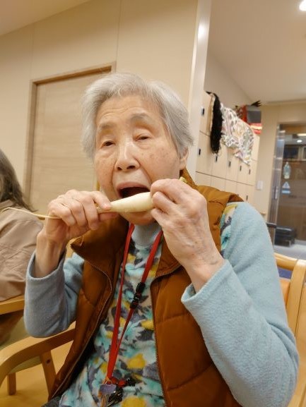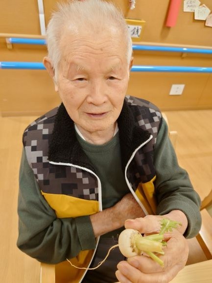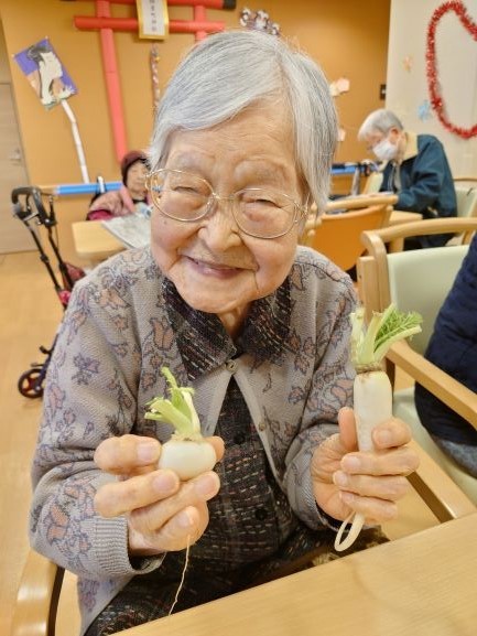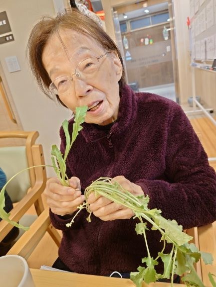 「デイサービスに来る前に朝ご飯で、七草粥、出たよ!」