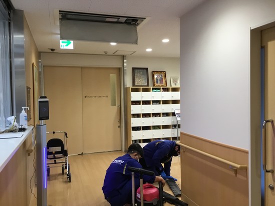 さて、先日弊社グループ会社あなぶきクリーンサービスの皆さんにより、館内の定期清掃が行われました。年2回実施しております。 共有スペースの床やエアコンなど、朝9時過ぎから夕方頃まで丁寧にお掃除していただきました。