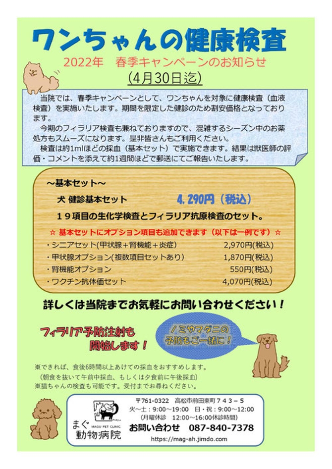 おもにワンちゃんを対象としており今期のフィラリア検査も兼ねています。