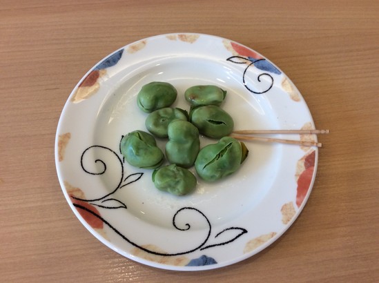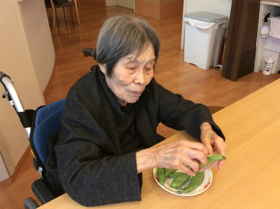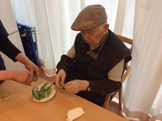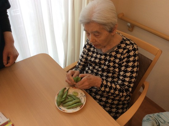 収穫された【そら豆】は、レストランで入居者様に剥くのを手伝っていただき、その後調理することにしました。