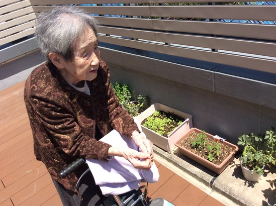 入居されてからは、日中は居室でお過ごしになる事が多かったのですが、最近では4階のフロアでくつろがれたり、テラスでひなたぼっこされたりしています。