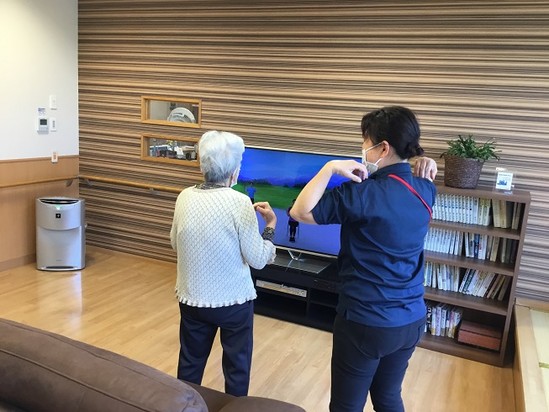 娯楽室にいらっしゃる入居者様と一緒に体を動かすこと~