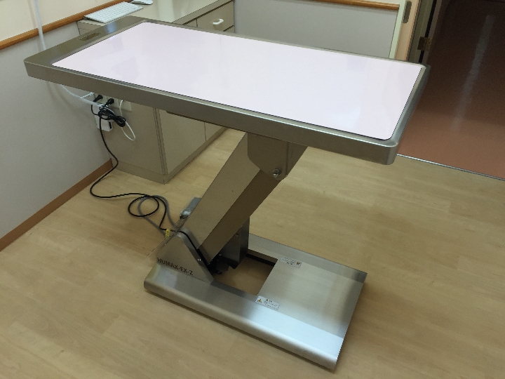 第1診察室の診察台をこれまでと同様の床近くまで下がる低床電動タイプに変わりました。今回のタイプは体重が飼い主様にも見えるようになっています。