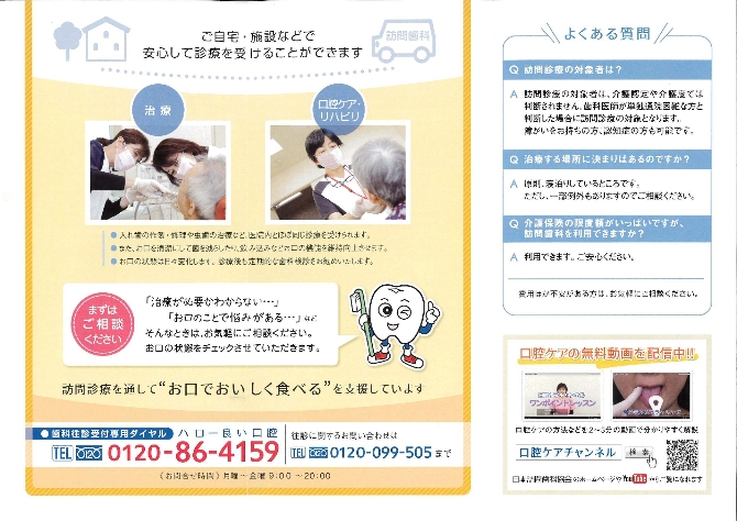 【訪問歯科について】 ご自宅・施設などで診療を受けることができます。 『治療が必要か?』『お口の悩みがある』などある方はお気軽に相談ください。 -訪問診療の対象者- 介護認定や介護度では判断されません。 歯科医師が単独通院困難な方と判断した場合に訪問診療対象となります。 ※障がいをお持ちの方、認知症の方も対象。